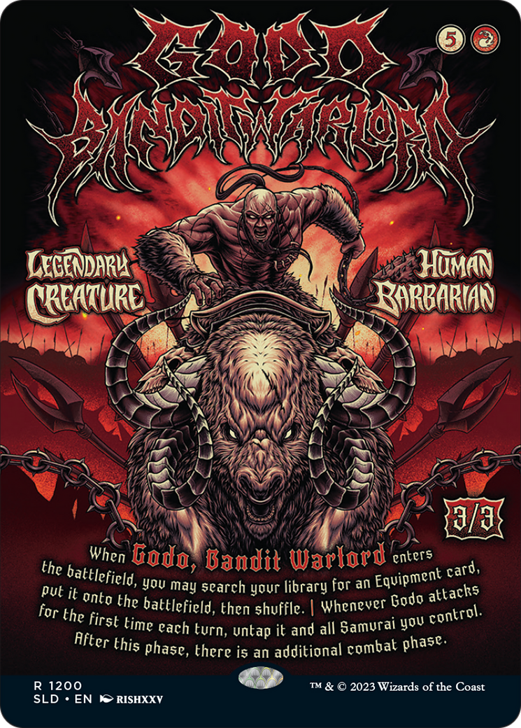 When Godo, Bandit Warlord enters the battlefield, you may search your library for an Equipment card, put it onto the battlefield, then shuffle. | Whenever Godo attacks for the first time each turn, untap it and all Samurai you control. After this phase, there is an additional combat phase.