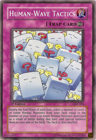 During the End Phase of each turn, select a number of Level 2 or lower Normal Monsters from your Deck equal to the number of your Level 2 or lower Normal Monsters destroyed as a result of battle during that turn, and Special Summon them to your side of the field. The Deck is then shuffled.