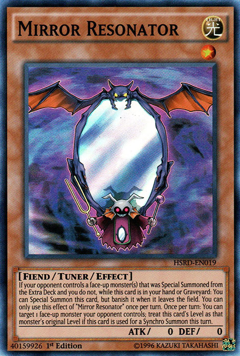 While this card is in your hand or Graveyard, if your opponent controls a monster that was Special Summoned from the Extra Deck, and you do not: You can Special Summon this card, but banish it when it leaves the field. You can only use this effect of "Mirror Resonator" once per turn. Once per turn: You can target 1 face-up monster your opponent controls; if this card is used as a Synchro Material this turn, treat this card's Level as that target's original Level.