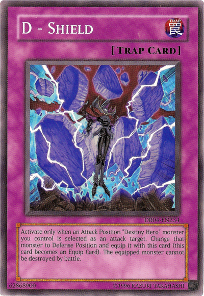 Activate this card when the attack mode monster with [D-Hero] in its name on your field become an attacked target. This card becomes the equipment card, equip this card to the monster which become an attacked target. Switch the mode of that monster to defense mode. The equipped monster cannot be destroyed as a result of battle.