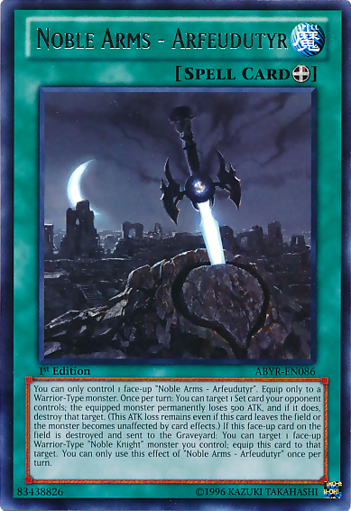 You can only control 1 face-up “Noble Arms – Arfeudutyr”. Equip only to a Warrior-Type monster. Once per turn: You can target 1 Set card your opponent controls; the equipped monster permanently loses 500 ATK, and if it does, destroy that target. (The ATK loss remains even if this card leaves the field or the monster becomes unaffected by card effects.) If this face-up card on the field is destroyed and sent to the Graveyard: You can target 1 face-up Warrior-Type “Noble Knight” monster you control; equip this card to that target. You can only use this effect of “Noble Arms – Arfeudutyr” once per turn.