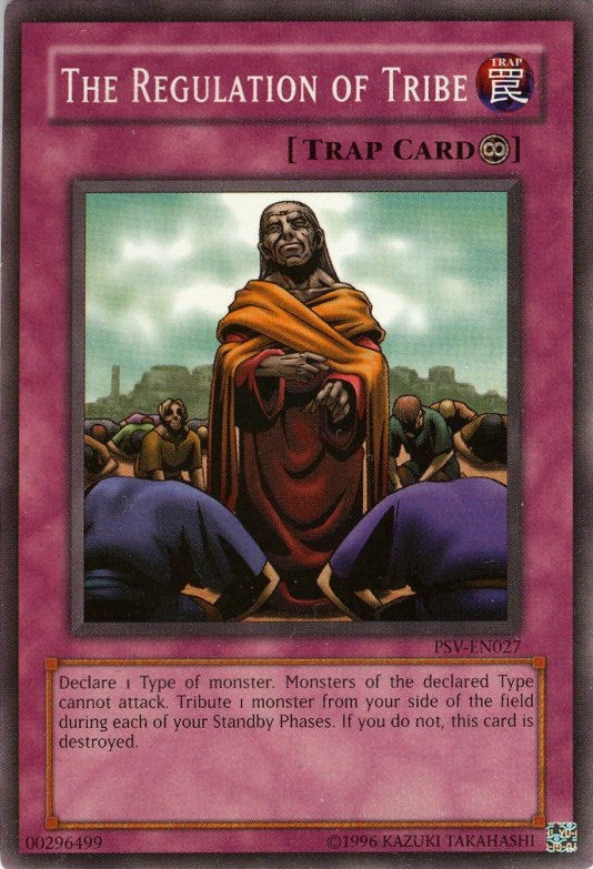 Select 1 Type of monster. Any monster of the selected Type cannot attack. To keep this card in effect, you must offer 1 monster from the field as a Tribute at each of your Standby Phases. If you cannot, this card is destroyed.